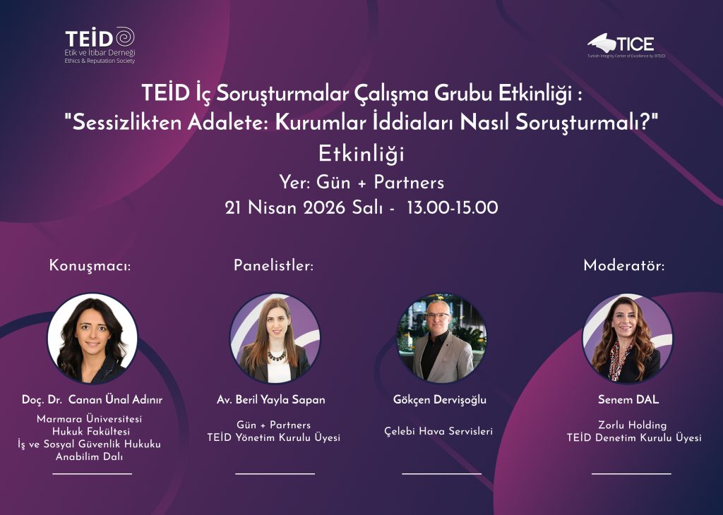 Panelde, Marmara Üniversitesi Hukuk Fakültesi’nden Doç. Dr. Canan Ünal Adınır’ın keynote konuşmasının ardından; Zorlu Holding İç Denetim, Kontrol ve Etik Genel Müdür Yardımcısı ve TEİD Denetim Kurulu Üyesi Senem Dal moderatörlüğünde, Gün + Partners’tan ve TEİD Yönetim Kurulu Üyesi Av. Beril Yayla Sapan ile Çelebi Hava Servisleri İnsan Kaynakları Direktörü Gökçen Dervişoğlu konuya ilişkin tecrübe ve değerlendirmelerini paylaşacaklardır.
